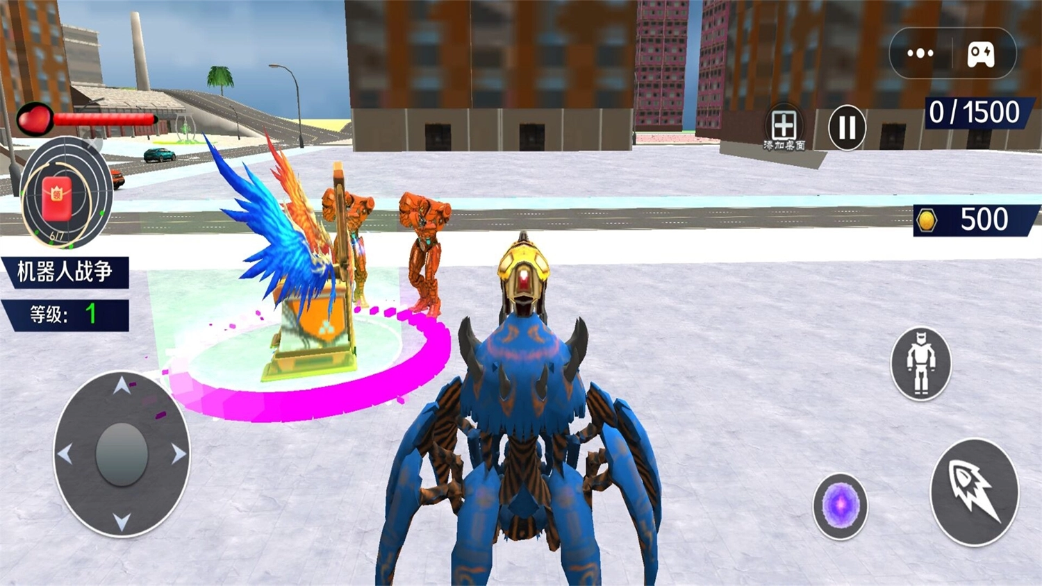 挑选出你喜欢的机器人或机甲载具,借助虚拟按键操控它们进行移动与攻击,在城市环境里搜寻并破坏敌人和各类车辆。