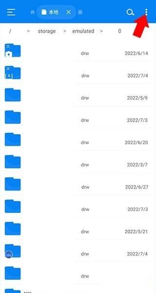 2、点击后进入下方界面,能看到手机里的所有文件夹(此处已对文件夹名称做了涂抹处理),若要对这些文件夹进行存储空间分析,可点击右上角的三个竖排点按钮。