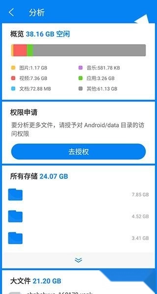 3、随后会弹出窗口,我们点击分析解开,查看当前占用手机存储空间最大的文件夹以及所有大文件,这样方便用户对无用的大文件进行管理和删除操作(建议删除前点击查看该文件是否为需要保留的文件)