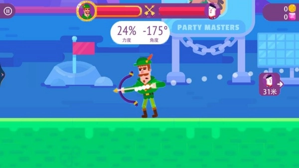你可以依据和对手之间的距离,通过拖动屏幕来调节弓箭的瞄准角度与拉弓时的力度,从而找到最理想的攻击轨迹。