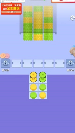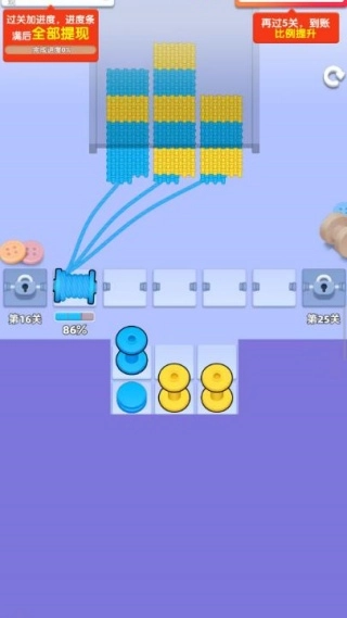 仔细观察上方毛线堆的颜色分布情况,优先选择点击底部与毛线堆颜色相同的线轴,精准地消除对应的颜色毛线堆,与此同时要留意进度条的变化。