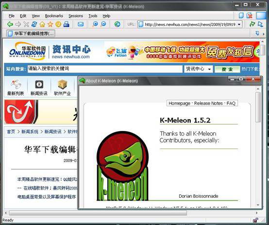 K-Meleon是一个快速的浏览器,使用 Gecko 引擎。它的界面模仿IE的风格,并且能够使用IE的书签。它最主要的特点就是下载页面的速度相当的快,这对于网速不是很快的中国用户还是很有优势的。