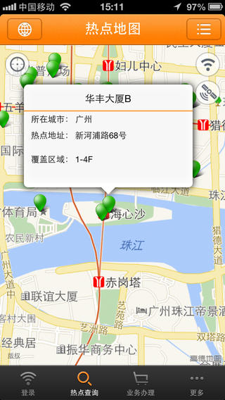 4.选择热点查询,可获知所在区域附近的所有中国移动WLAN热点