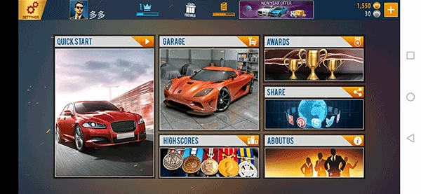 要是想玩游戏,直接点击quick start(快速比赛)就行;你也能去garage(车库)里挑选自己心仪的车辆来参与比赛。