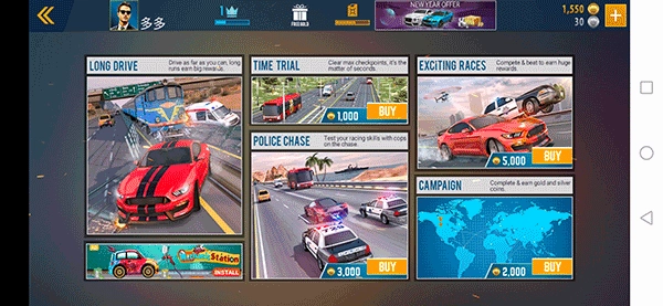 提供多种竞赛模式选择,包括普通竞速、计时挑战、警察追捕、速度对决与故事剧情模式。