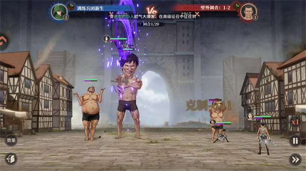 核心玩法围绕策略卡牌搭配展开,玩家需要结合角色特性与巨人类型,构建出高效的调查兵团阵容。