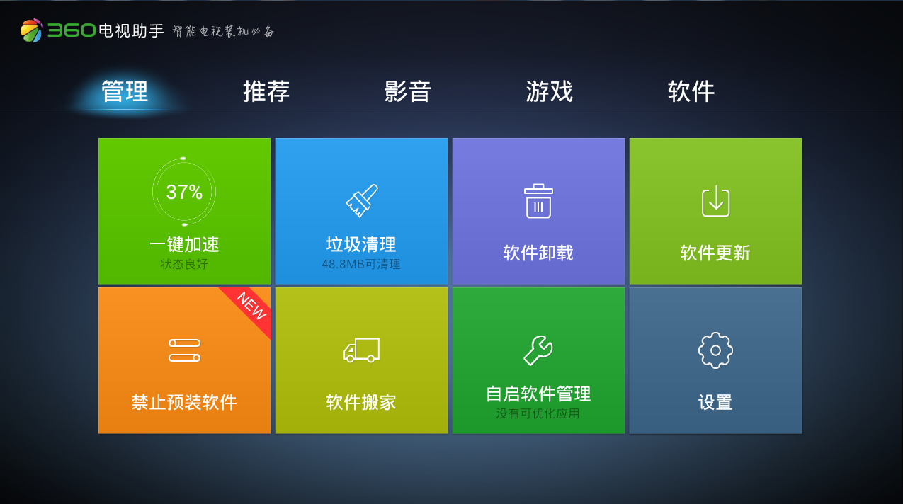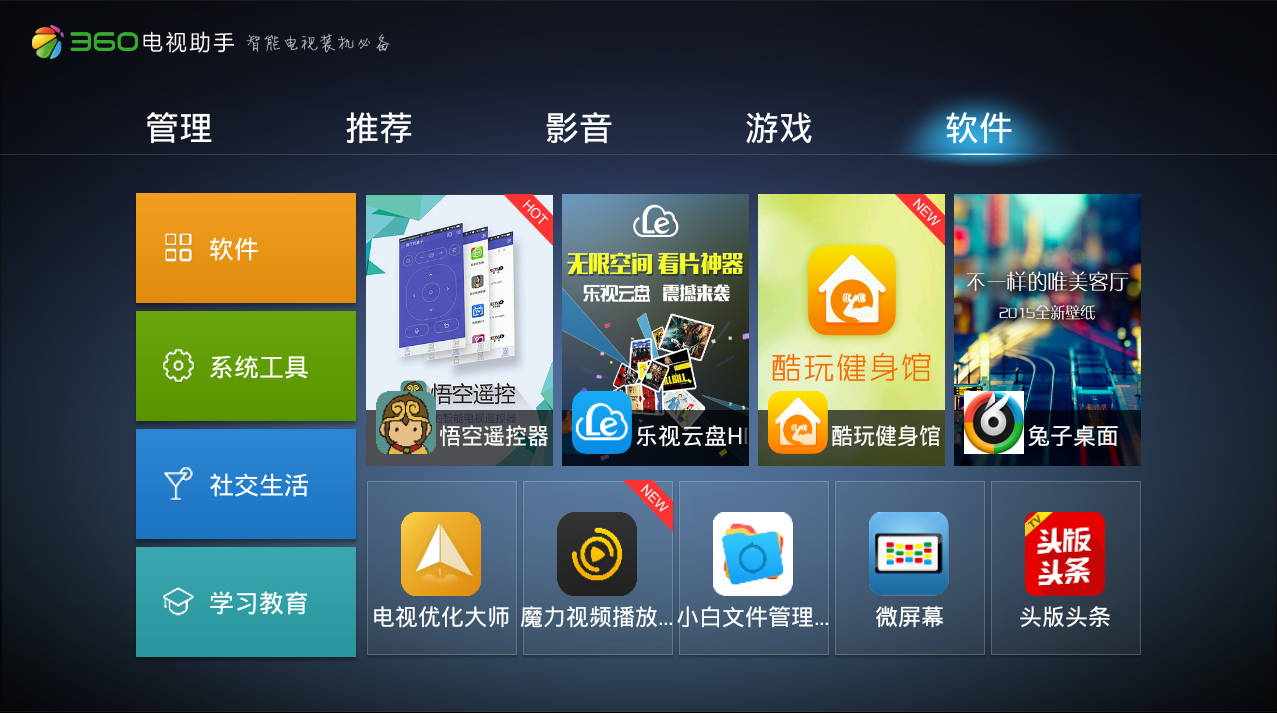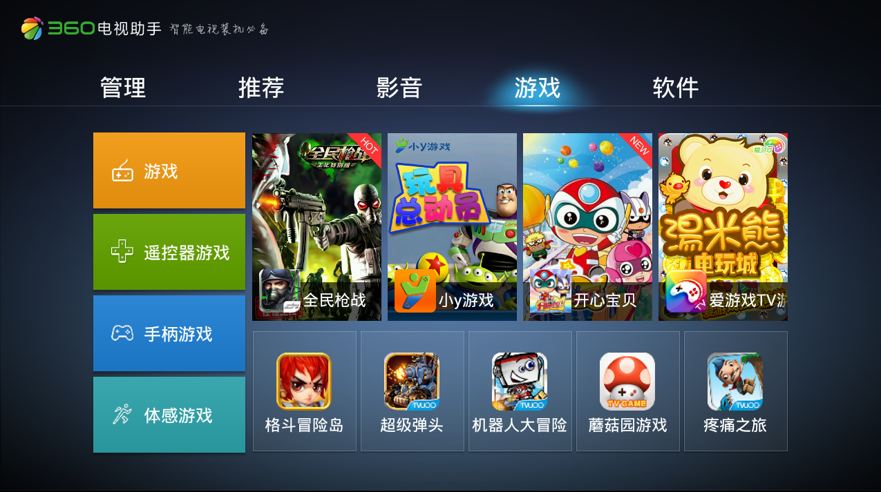 360电视助手tv版—是android智能电视的资源获取平台。提供海量的游戏、软件、音乐、小说、视频、图片,通过它轻松下载、安装、管理手机资源。所有提供信息资源,全部经过360安全检测中心的审核认证,绿色无毒,安全无忧。360电视助手tv版界面看着简约,布局合理搭配50寸的屏幕,视觉效果还是挺好的。但是感觉内容少, 这个也是目前网络电视的普遍问题。如果在进入页面的时候,能选择遥控器还是鼠标键盘就好了,我用鼠标键盘比遥控器方便多了。能进行双界面操控是最好的。背景页面不是很喜欢,希望能换个靓丽的色彩。