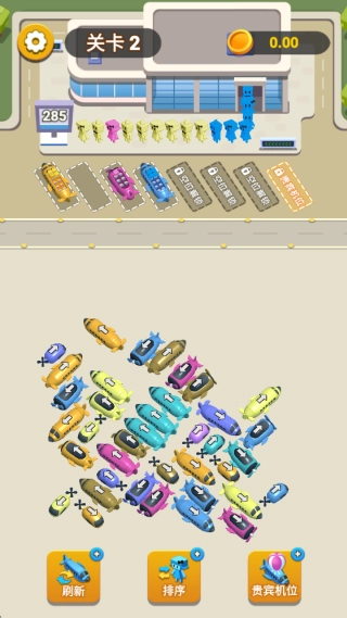 当车辆载满小人后就能开走,空出更多车位,要不断调整车辆的摆放位置,防止出现车位被塞满的失败状况。