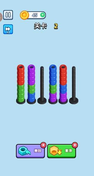 观察关卡2里那些已经分好类的纯色螺丝柱,先把同颜色的零散螺丝移到对应的柱子上,同时可以利用空柱子暂时存放混色的螺丝,注意别把已经整理好的顺序弄乱了。