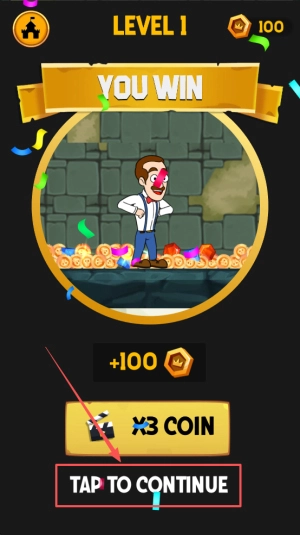 通关领奖的操作说明如下:当游戏画面上出现“YOU WIN”以及“+100 X3 COIN”的提示时,只需点击界面上的“TAP TO CONTINUE”按钮,就能成功领取对应的奖励,并且自动进入到下一个关卡。