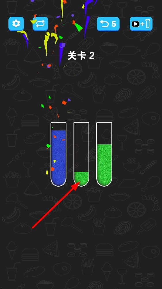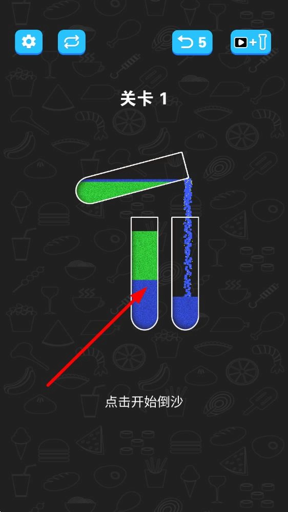 进入界面后,点击试管顶部来倾倒沙子。每次倾倒时,要保证目标试管有足够的容纳空间,并且沙子的颜色与目标试管内的沙子颜色相匹配。长按操作能够控制沙子的倾倒速度。