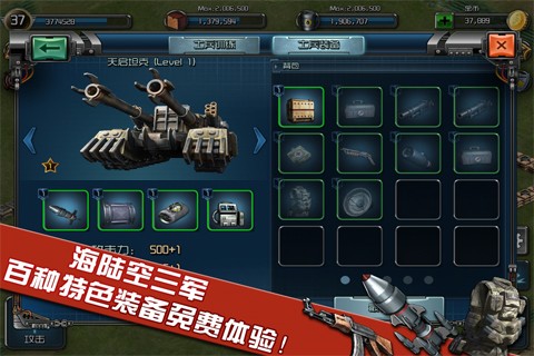 -铁血战争彰显男人的浪漫在《火力全开》中,你将会与数十万玩家体验真正的钢铁兵器的终极对抗,海陆空三维立体的全面战争!精心设计的PVE关卡战、紧张刺激的PVP掠夺战……在这里,大大小小的战争从未停止,疯狂的军团对抗从未休战,只有拥有最多钢铁军团的你,才能在激烈的战争中奋勇向前,赢得最后的胜利!