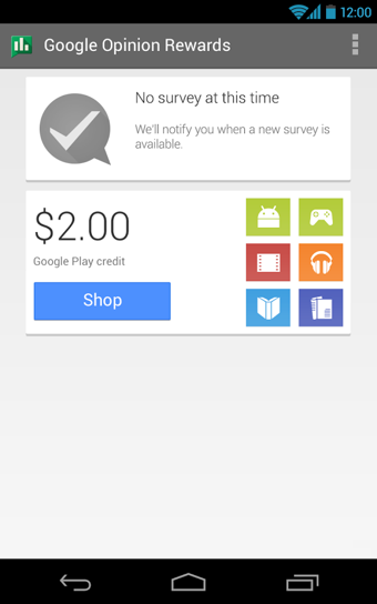 Google Opinion Rewards 手机调查问卷软件入门很容易。下载的应用程序,并回答关于自己的基本问题。然后,我们将围绕向您发送调查,每周一次,尽管它可能是更多或更少。你会得到你的手机上的通知,当短期和相关的调查是为你准备好,并且最多可以接收到$ 1.00美元(或等值的当地货币),在播放学分完成它。问题的范围可以从“哪个标识是最好的?”和“哪个促销是最有说服力的?”以“当你计划前往下一个?”【更新日志】