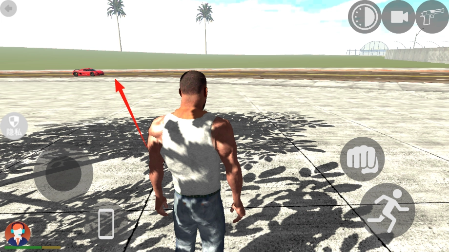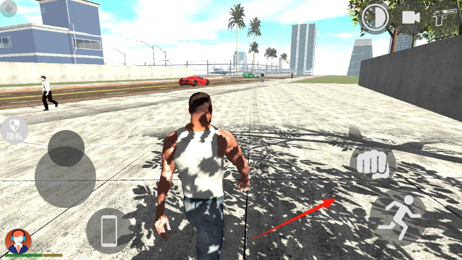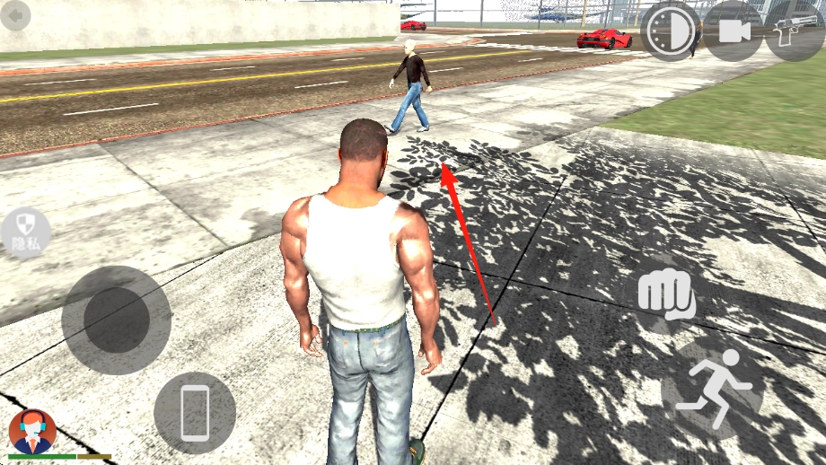 通过虚拟摇杆操控角色移动,右侧设有拳头、奔跑等功能按键,玩家可借助这些按键实现攻击、疾跑动作;按照箭头的指示方向,去追逐红色跑车,也能选择与路上的行人进行互动。