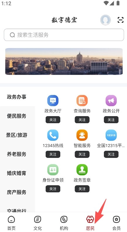 3、点击“居民”选项,即可进入政务办事、便民服务等功能板块,在此可办理身份证申领等相关事务。