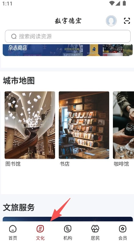 2、点击“文化”选项,即可查看城市地图中图书馆、书店等相关场所的信息,同时也能了解文旅服务的具体内容。