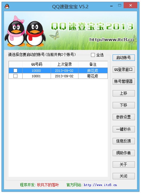 QQ速登宝宝是一款免费的qq批量登陆器,用于快速登录、关闭和管理QQ。它可以免去每次登录QQ时输入号码与密码的麻烦,同时可以有效防止木马使用记录键盘盗号,并且具有号码管理、快速登录和关闭等其他多种功能。