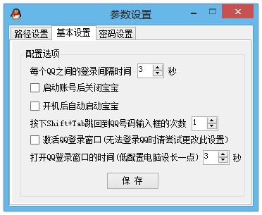 1、延时设定:设定QQ账号登录时间间隔(默认为3秒),请根据自己的电脑配置情况进行修改