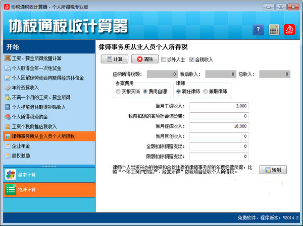 根据最新的《中华人民共和国个人所得税法》、《中华人民共和国个人所得税法实施条例》以及国家的相关规定,结合税务部门工作需要,并根据广大用户需求,精心编写的税收计算器。软件分为基本计算和特殊计算,功能覆盖个人所得税的十个税目、《中华人民共和国个人所得税法》及《实施条例》查询、批量计算工资薪金所得税、批量导入导出、滞纳金计算、全年奖金所得税计算、年终双薪所得税计算、工资个税倒推应税收入、律师事务所从业人员所得税计算等功能,并能提供避税建议。