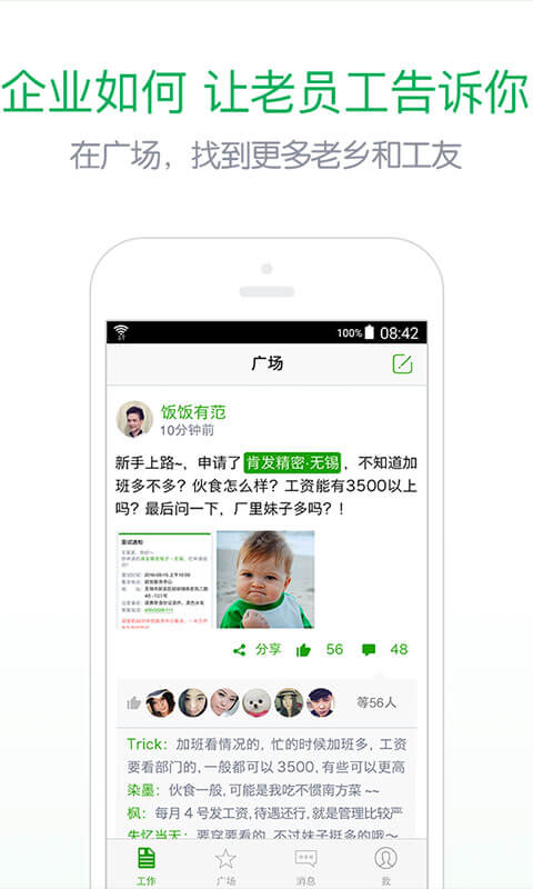 “一米工作”2.1.1版进行了全面的产品优化,界面更美观、功能更实用、内容更丰富。在这里,您可以找工作、找朋友、找老乡,找优惠,是最实用的蓝领工作、生活服务平台。