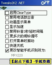 Tweaks2K2.NET V3.28.0.3 汉化版 一款SP/PPC平台的优秀优化软件,软件优化分三大项:系统优化,网络优化,安全优化;主要功能包括:平滑字体,挂断音,动态菜单,显示加速,响铃加速,关机加速,闹钟循环,点击"菜单"振动提示,修改IE缓存保存地址,修改系统路径,等一系列优化功能. 软件由.Net语言编写。