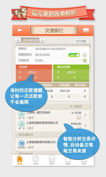 *自动解析账单,智能分析每笔交易;*人工审核活动,提供优质的商户优惠;