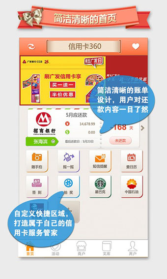 2013阿里云开发大赛金奖“云锋奖”产品;全5星好评!2013移动互联网金融明星产品,信用卡一族的救星!无论你是屌丝还是高富帅,都希望占尽银行便宜吧!又不希望被银行稀里糊涂赚钱吧!那就赶快使用“信用卡360”,使你能轻松玩转信用卡,轻松成为卡神!