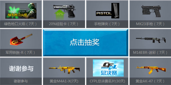 cfpl5直播期间,玩家观看直播获取幸运码,每次兑换可获得一次抽奖机会。下面就是抽奖的奖品,奖品非常丰富。【cfpl5(89个)幸运码大全】