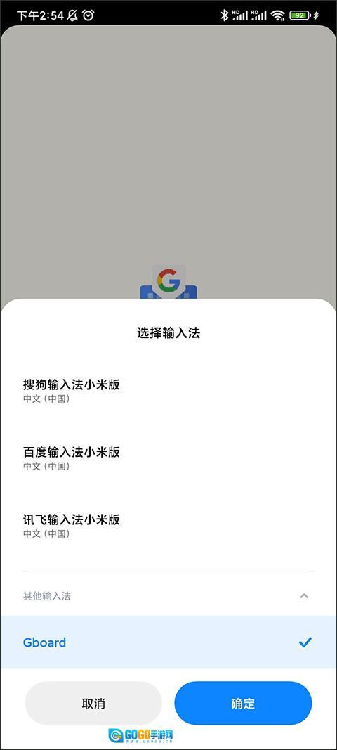 我们点击屏幕中的选择输入法,这个时候会跳出来一个弹框,让我们选择使用的输入法,我们在其他输入法内找到Gboard点击勾选它然后再点击确定就设置好了