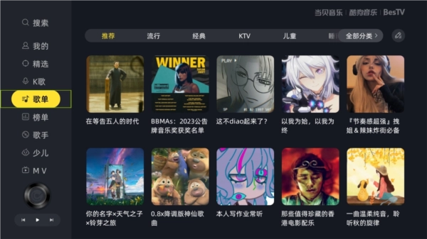 当贝酷狗音乐TV版是一款由当贝、百视通、酷狗联合为安卓智能电视及电视盒开发的电视音乐应用,里面拥有酷狗正版音乐曲库支持,还有为大屏而生的MV频道,配上酷狗独创的蝰蛇音效,让客厅充满音乐,让用户在家中就能够享受到一场听觉盛宴。当贝酷狗音乐带给用于各种惊喜,无损音质精选歌单,个性电台歌手专辑,歌单支持与手机同步。此外还有人气K歌功能震撼回归,拿起你的麦克风,唱响家庭KTV!当贝酷狗音乐拥有最专业的音频解码核心技术,搭配其强大的音乐搜索和高速功能,能够让用户随时享受完美的音乐体验。此外,当贝酷狗音乐tv版中为了提升用户体验,优化了播放器版本,且新增了海量的曲目,最值得一提的便是拥有高清全屏自动匹配功能,全面支持各种音频格式,用户能个性化自定义皮肤,非常实用。简而言之,如果你想在家里电视或者大屏设备上使用酷狗音乐,那么这款当贝酷狗音乐电视版定是你的不二之选。