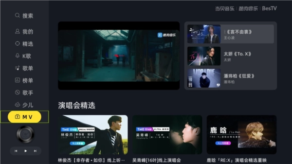 在当前歌曲页面,按遥控器上的【下键】弹出菜单,在里面选择【控制台】-【MV】即可查看当前歌曲的MV视频。