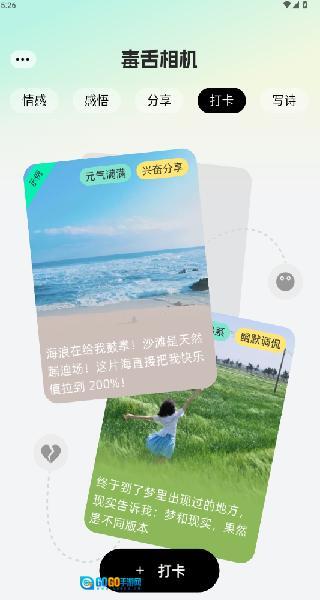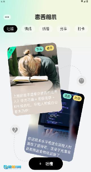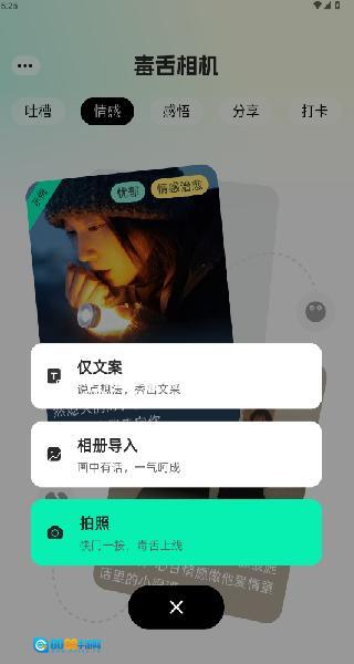 2、软件自带多个板块,有吐槽、情感、打卡、美食、旅游等等,每个板块都有专属文案和滤镜;
