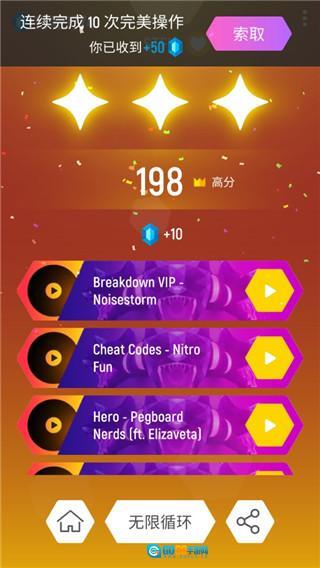 4.体验超燃音乐,挑战每首歌曲量身设计的节奏关卡——弹球会跟随节拍跃动,请仔细聆听旋律、凭借乐感指引弹球在砖块间跳跃。
