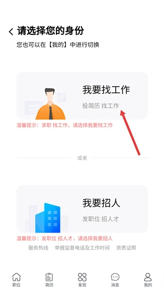 1、进入身份选择页面,点击【我要找工作】选项,选定求职身份,进入对应的登录/注册流程。