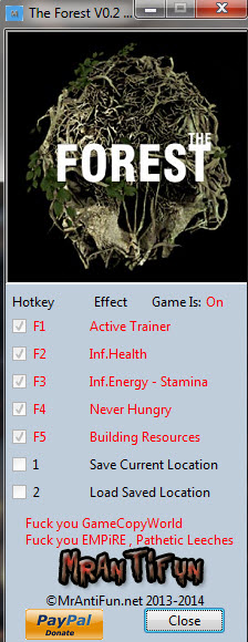 森林是一款近期推出的恐怖类生存冒险游戏,玩家将在茂密黑暗的森林中利用一切资源,坚强的生存下去,期待您的加入。本次给玩家带来一款该游戏的辅助修改工具,添加了无线生命、能量以及不会饥饿等六项修改功能,充分满足玩家需求,适合新手玩家哦。【使用方法】