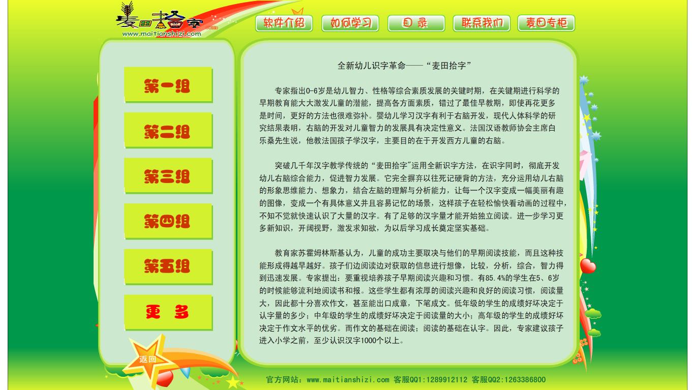3.看了“麦田拾字”的孩子,在幼儿园就能够认识所有同学的姓名,老师们都感觉不可思议! 震撼全国少儿识字界的“麦田拾字”每个汉字都有详细解说、拼音、常用组词、记忆方法等等。