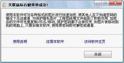 使用本软件可对各种格式的图片进行快速加密,使其他人在不知道密码的情况下无法查看.对保护隐私图片,工程图纸等文件起到了积极作用.加密后的文件可任意复制/改名/移动,保护密码都不会被改变.如图片被移动到别的电脑上,只需安装本软件,使用原密码即可解密或查看
