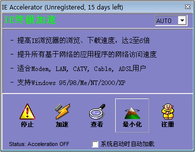 《IE终极加速》是一个非常不错的实时网络优化加速工具,可使IE在网上冲浪和下载文件的速度增长2-6倍!与以往修改注册表参数达到优化目的的软件不同的是,通过监视IE浏览器的状态,智能将下一个或多个最可能的页面的部分或全部装入自己的缓冲,起到了一个实时加速的作用。支持Modem, LAN, CATV, Cable, ADSL连接下的IE 3/4/5/6版本的优化,而且优化过程完全智能化!