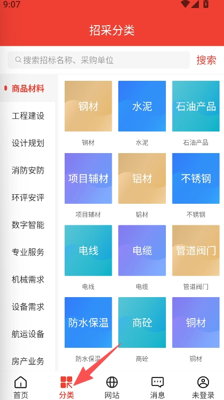 1、点击分类按钮,进入招采分类页面。
