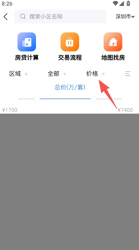 3、价格调节功能,拖动滑块即可调整总价范围,以适配不同预算需求,从而锁定符合对应价格的房源。