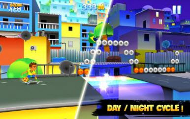 天空滑行者安卓版游戏中可以有四个角色供玩家选择,除了帅哥跟萌妹子,还有一直狗熊,滑行的地点都是在屋顶上,滑动的过程中得不停地吃金币,获得的金币可以用于提升滑板属性、购买滑板,没滑一定的距离就会来到奖励模式。在滑行中,不时会出现直升机,要是被障碍绊倒了,则会被警察所抓了,为了让自己复活过来,那就得花费人民币了。