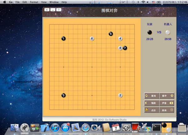 1. 棋盘可选择9路、11路、13路、19路进行对弈, 机器人棋力水平分为6个级别, 可以相互让子最高到9子。2. 对局中随时可以悔棋, 点目, 还设置有时间限制。