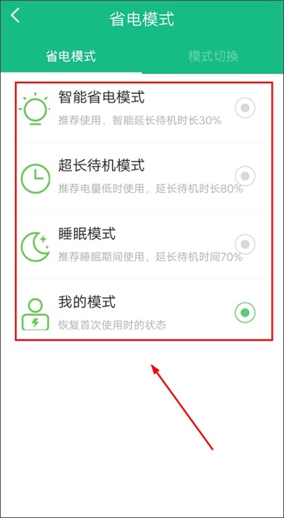 2、在【模式】页面点击【省电模式】,此操作属于手动设置:用户可依据自身电量状况,选择适配当前情况的省电模式。