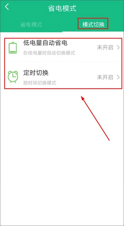 3、点击【模式切换】,这里支持自动设置功能:用户可以设定在低电量时自动开启省电模式,也能设置定时开启省电模式,以此帮助用户更便捷地实现设备的长时间使用。
