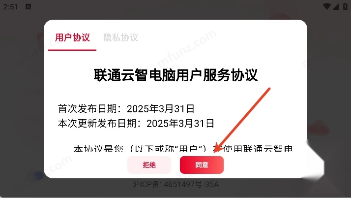 1、打开联通云智电脑阅读协议并点击同意