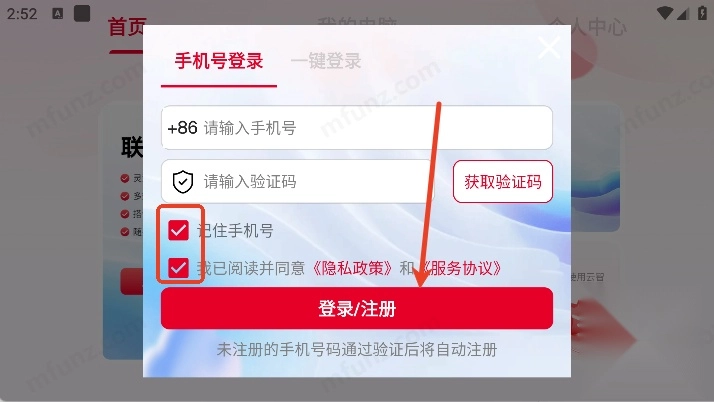 3、勾选协议按钮,点击登录/注册即可