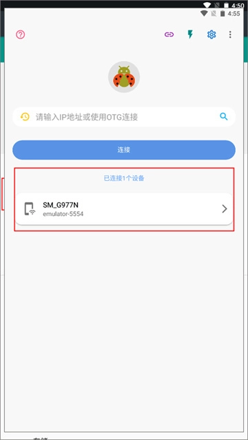 4、这时,我们在新设备上启动甲壳虫ADB助手,输入被控设备的IP地址与端口号,就能连接至手机设备了。