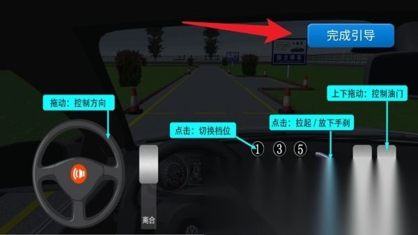 5、操作界面支持通过拖拽方向盘来调整行进方向,通过上下滑动操作来控制油门与刹车,再配合换挡和手刹的操作,完成引导流程后就能正式开始训练。