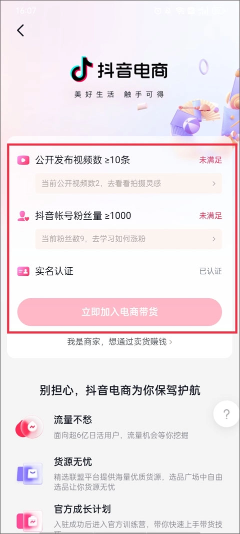 然后实名认证完成入驻抖音电商平台即可进行带货了