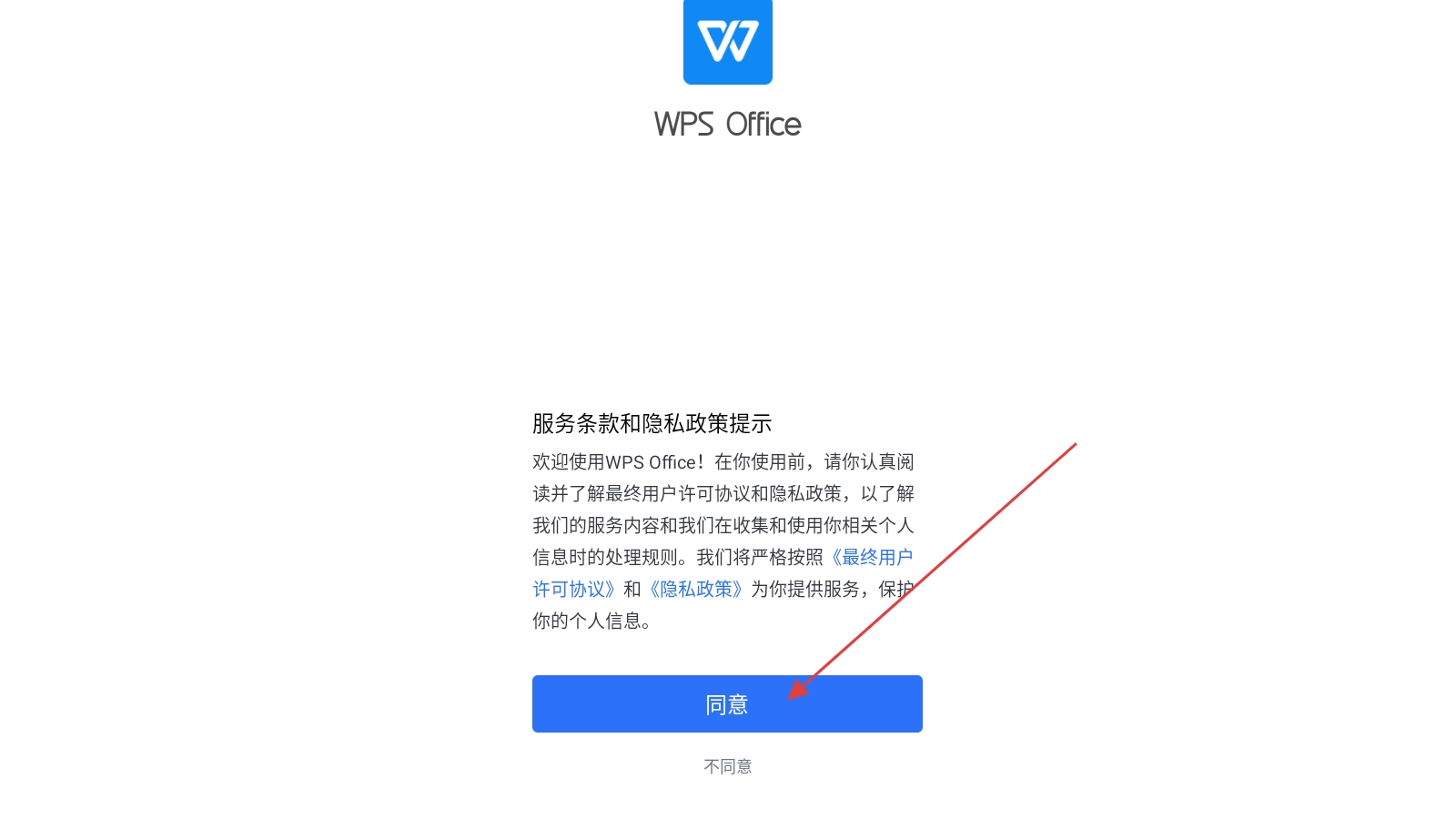首次启动WPS专业版时,点击【同意】以接受服务条款和隐私政策。